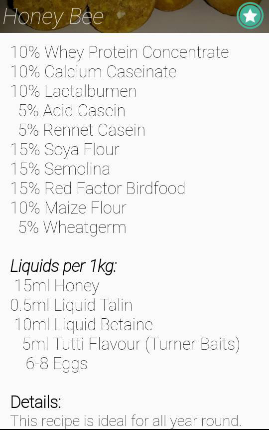 Nejdříve rozmixujeme tekuté složky, smícháme suché složky, smícháme dohromady, s tekutýma složkama opatrně, aby těsto nebylo moc řídké, na 1kg těsta by mělo přijít 650ml tekutiny, požadovaná konzistence je jako docela tuhá plastelína. Po uhnětení necháme těsto alespoň 20 minut odstát a můžeme se pustit do výroby. Tento recept mám vyzkoušený. Jedná se o základní boilies recept, těsto se snadno zpracovává, má silné aroma, při vaření se kuličky nedeformují, nepraskají při sušení, jsou docela težké a dobře se kobrují. Rybu na lovné místo přilákají a udrží ji tam.